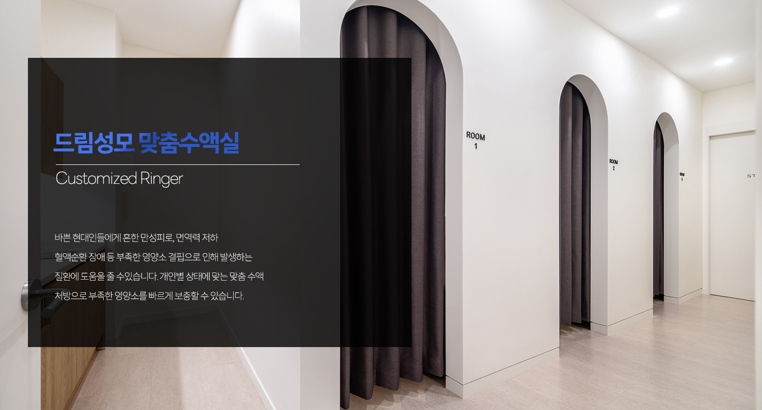 Á¤¸Æ Áֻ縦 ÅëÇØ °³ÀÎÀÇ »óÅÂ¿Í Çʿ信 µû¶ó ¿µ¾ç¼Ò ÁÖ»çµéÀ» ÀûÀýÈ÷ È¥ÇÕÇÏ¿© Á¤¸Æ¿¡ ÁÖ»çÇÏ´Â ¹æ¹ýÀÔ´Ï´Ù.¾à 20¿© Á¾ÀÇ È¥ÇÕ °¡´ÉÇÑ ¿µ¾ç¼Ò ÁÖ»ç(ºñŸ¹Î, ¹Ì³×¶ö, ŹÝ, °¨ÃÊ, ¸¶´Ã ÁÖ»ç µî)À» º¸À¯Çϰí ÀÖÀ¸¸ç ±× Áß¿¡¼ ȯÀÚ¿ÍÀÇ »ó´ã ÁøÂû ¶Ç´Â ±â´ÉÀÇÇÐÀû °Ë»ç °á°ú¿¡ µû¶ó ÀÇ»çÀÇ ÆÇ´Ü¿¡ ÀÇÇØ ¿µ¾ç¼ÒµéÀ» È¥ÇÕÇØ¼ Åõ¿©ÇÔÀ¸·Î½á ´õ ÁÁÀº È¿°ú¸¦ º¼ ¼ö ÀÖ½À´Ï´Ù.